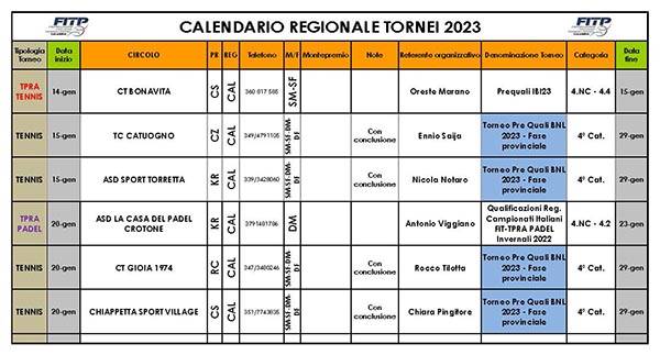 HomeCalendario Regionale TorneiCalendario regionale dei tornei, aggiornato al 09 Gennaio 2023 Calendario Regionale Tornei Calendario regionale dei tornei, aggiornato al 09 Gennaio 2023 By CalabriaTennis 9 Gennaio 2023 0 3929 Share FacebookTwitterPinterestWhatsApp 09[themoneytizer id=”21808-28″] CALENDARIO TORNEI CALABRIA 2023 – agg. 09.01.2023 https://www.federtennis.it/Siti-regionali/Calabria/ TagsCalendario Regionale dei TorneiFit Calabria Share FacebookTwitterPinterestWhatsApp Previous articlePREQUALI IBI 23 – INIZIA IL VIAGGIO VERSO ROMANext articlePREQUALI IBI 2023: COSENZA E VIBO VALENTIA PRONTI PER ROMA CalabriaTennis RELATED ARTICLES Calendario Regionale Tornei Calendario Tornei di Categoria Calabria – agg. 10.10.2025 10 Ottobre 2025 Calendario Regionale Tornei Calendario Tornei Tennis di Categoria Calabria – agg. 04.08.2025 4 Agosto 2025 Calendario Regionale Tornei CALENDARIO TORNEI di CATEGORIA CALABRIA – agg. 21.03.2025 14 Aprile 2025 Most Popular Tc Cosenza: Campionato Regionale Veterani 2025 11 Ottobre 2025 TENNIS VETERANI, ECCO “EX GEN CALABRIA 2025” 10 Ottobre 2025 Calendario Tornei di Categoria Calabria – agg. 10.10.2025 10 Ottobre 2025 SC Lamezia: Campionati Regionali Assoluti 2025 10 Ottobre 2025 CT Polimeni: Master Q-Challenge 2025 8 Ottobre 2025 Sára Bejlek vince il WTA 125 Internazionali di Calabria 7 Ottobre 2025 CT Gioia 1974: 7ª Tappa Circuito Q-Challenge 2025 30 Settembre 2025 WTA 125 Rende: Brancaccio e Zantedeschi avanti 30 Settembre 2025 Le nuove leve calabresi si distinguono nei tornei internazionali 24 Settembre 2025 Master Batti 5 : Chiappetta SV, il cuore pulsante dei baby tennisti 18 Settembre 2025 TC Roccella: Roccella Tennis Cup – 3ª Categoria SM 17 Settembre 2025 MACROAREA SUD, IL “POLIMENI” A UN PASSO DALL’IMPRESA 16 Settembre 2025 BEATRICE VELTRI, IL PRIMO PUNTO WTA 13 Settembre 2025 Batti 5 Junior Tennis Master: a Rende il futuro del tennis cresce con i valori dello sport 13 Settembre 2025 Classifiche federali: promozioni Settembre 2025. Cerca il tuo nome… 11 Settembre 2025 TC Taurianova: 6ª Tappa Circuito Q-Challenge 2025 11 Settembre 2025 Load more Recent Comments