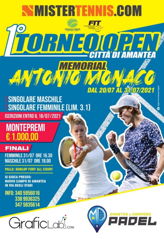 Il CT ANTONIO MONACO indice ed organizza i Torneo Open denominato CT Antonio Monaco – Open Città di Amantea – S/M-F € 1000 dal 20/07/2021 al 31/07/2021 sui propri campi siti in Via degli Stadi, Amantea (CS).
