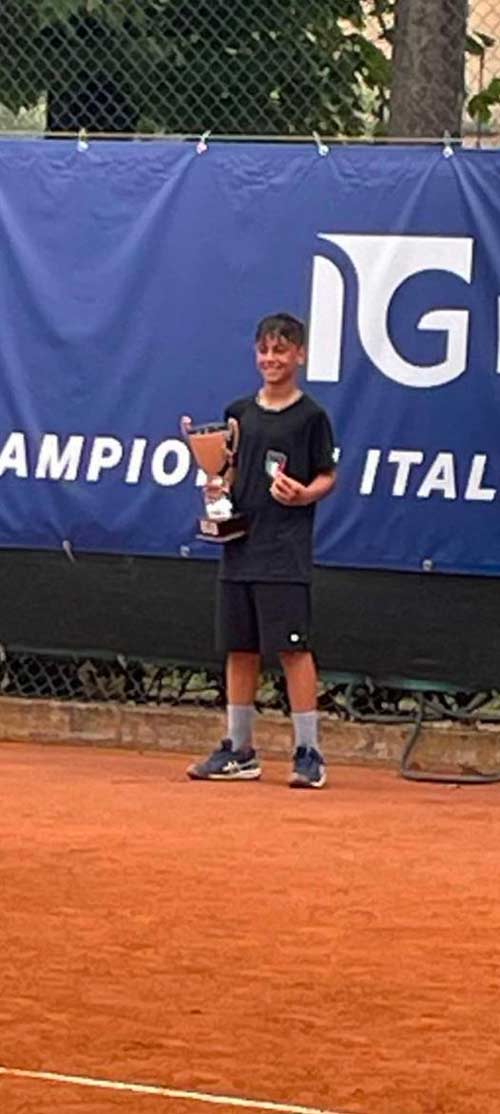 L’immagine mostra Giovanni Di Leva, fresco vincitore del campionato italiano under 12 al Tennis Club Milano Bonacossa, mentre posa con il trofeo accanto al suo avversario e ad alcune figure istituzionali.