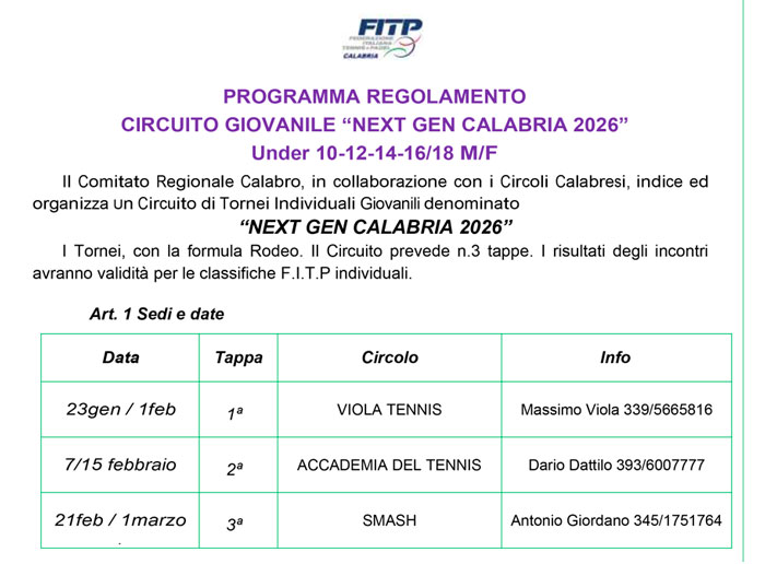 Il Circuito giovanile Under 10-12-14 -16/18 prevede n.3 tappe. I risultati degli incontri avranno validità per le classifiche FITP individuali 2026.