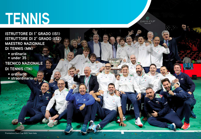- Tennis: Istruttori di 1° e 2° grado, Maestri Nazionali, Tecnici Nazionali ordinari e straordinari